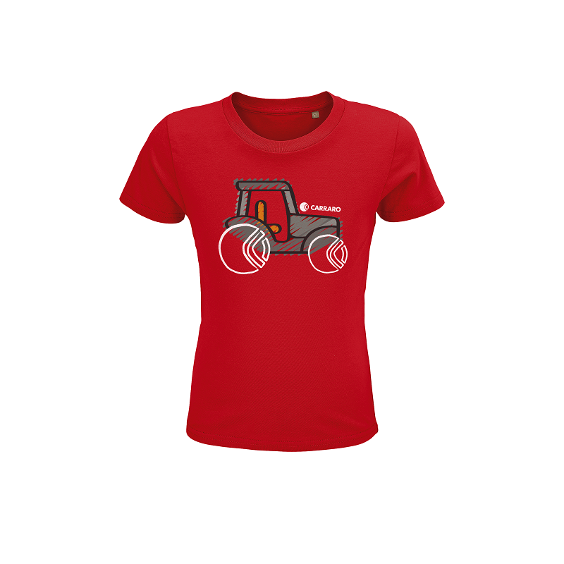 T-shirt rossa per bambini con un originale disegno a tema trattore sul davanti.